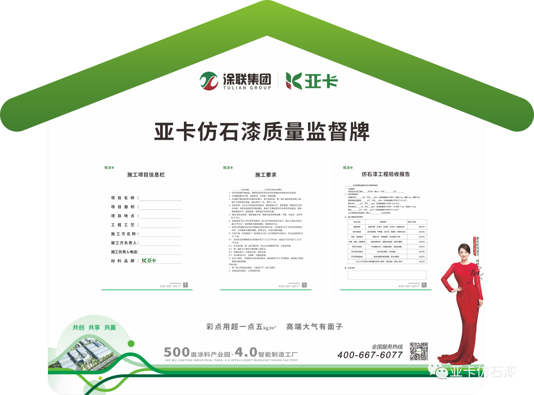 亞卡為客戶定制質量監(jiān)督牌,讓每位業(yè)主參與并看到亞卡施工師傅的每道工藝按標準施工,確保流程、次數(shù)、用量,關鍵彩點用量超出1.5KG/平方,讓亞卡仿石漆在每家業(yè)主墻上呈現(xiàn)逼真仿石效果,在效果端堅守品質。
