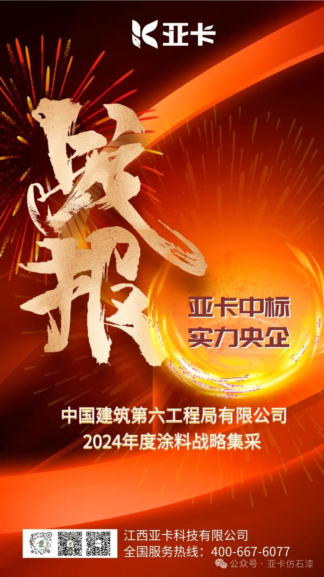 2024年6月,以豐富的行業(yè)經(jīng)驗、高質(zhì)高效的產(chǎn)品和服務、過硬的項目落地能力,亞卡涂料牽手央企,成功中標中國建筑第六工程局有限公司2024年度涂料戰(zhàn)略集采,共同譜寫城市建設發(fā)展新篇章!