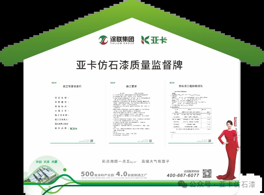 亞卡始終保持初心,與亞卡施工隊伍一起,用工匠精神對待每一次墻面施工,嚴格按亞卡屬性的“彩點用超1.5KG”標準用量及施工流程,為超過千家萬戶呈現(xiàn)更逼真、高仿石、高端又精致的外墻效果。
